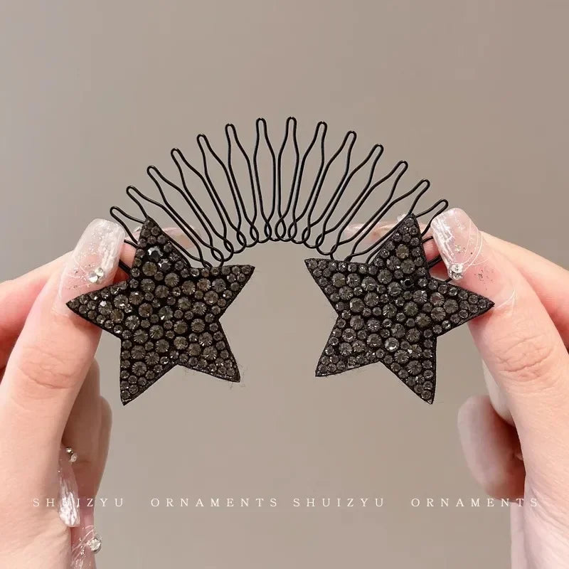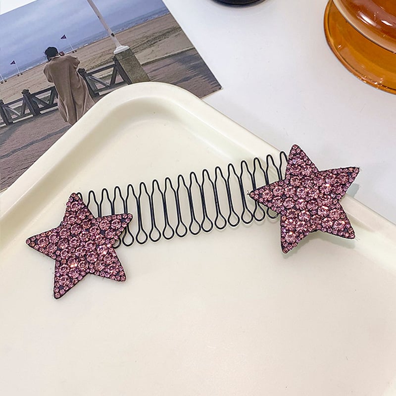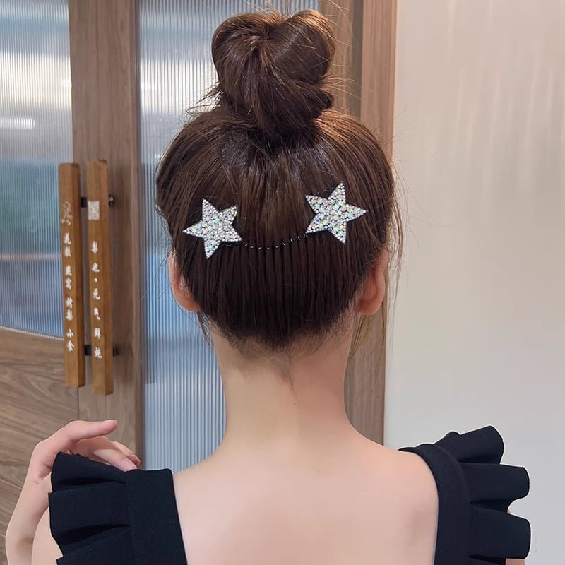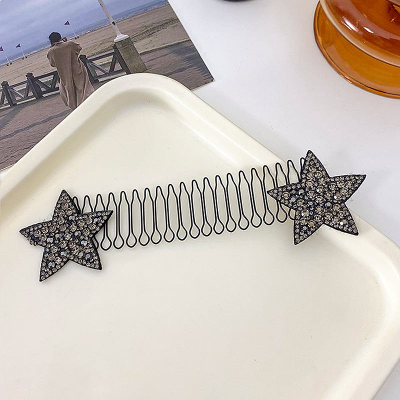 Com duas hastes em mola entrelaçada e pentes integrados, a presilha fixa o cabelo com pressão uniforme sem machucar, puxar ou soltar. E o melhor: o acabamento com estrelas de strass transforma qualquer penteado em um look elegante.